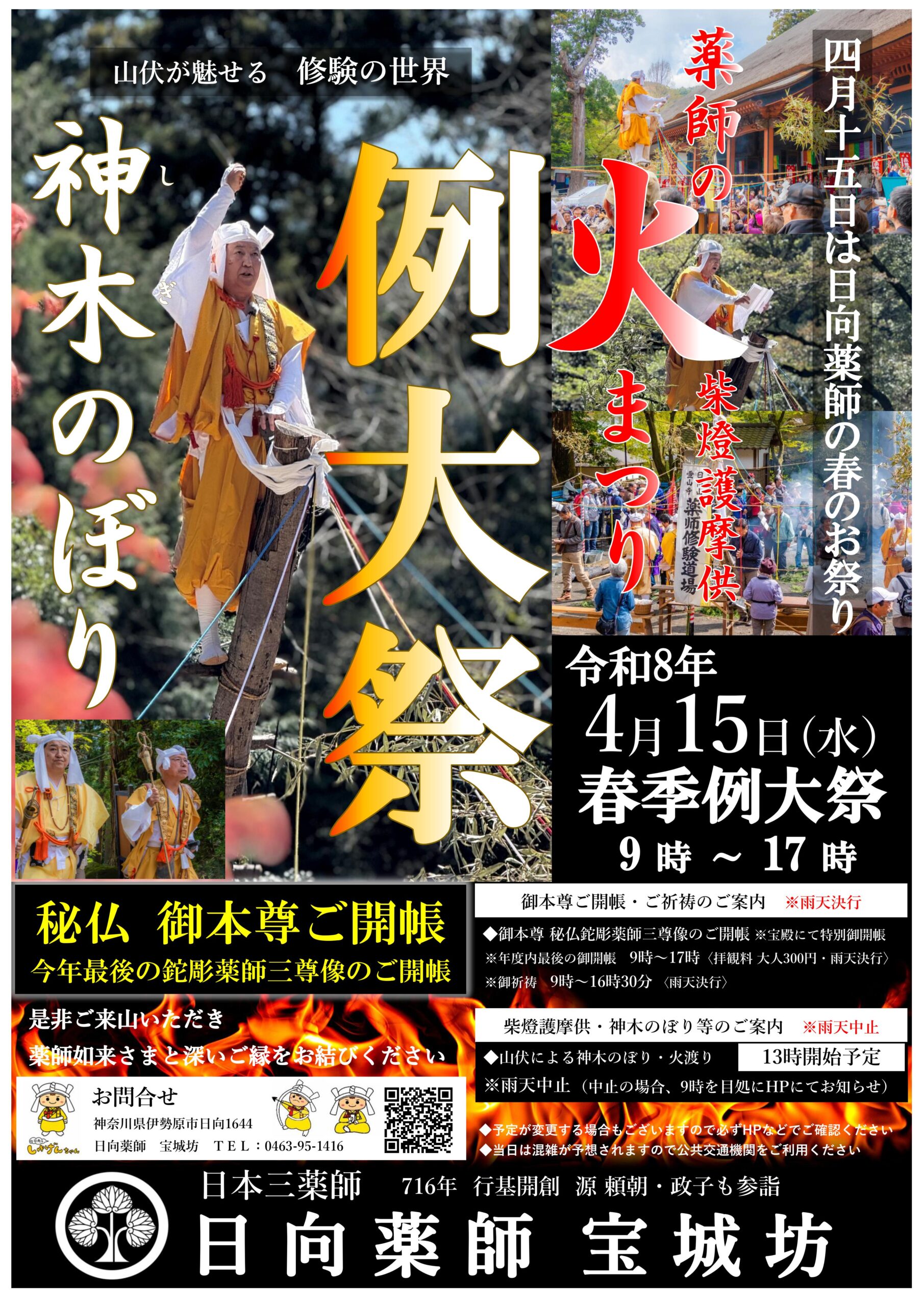 年度内最後となります御本尊鉈彫薬師三尊像のご開帳をはじめ、柴燈護摩供、修験者(山伏)による「神木(しぎ)のぼり」や火渡りを行います。